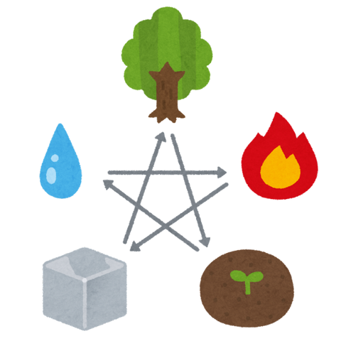 五行とは、世の中の森羅万象のすべては、木・火・土・金・水(もく・か・ど・ごん・すい)と呼ばれる五つの性質から成り立っているという考え方です。