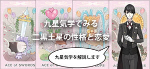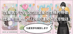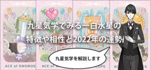 九星気学の九星には一白水星(いっぱくすいせい)、二黒土星(じこくどせい)、三碧木星(さんぺきもくせい)、四緑木星(しろくもくせい)、五黄土星(ごおうどせい)、六白金星(ろっぱくきんせい)、七赤金星(しきせききんせい)、八白土星(はっぱくどせい)、九紫火星(きゅうしかせい)の九つの星があり、生年月日から自分がどの星か導き出されます。
