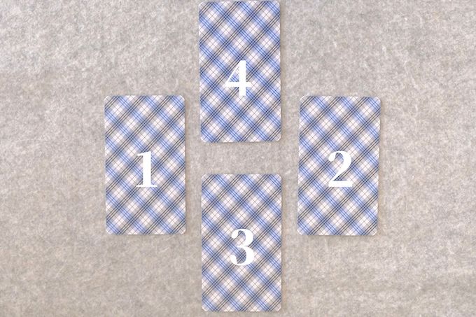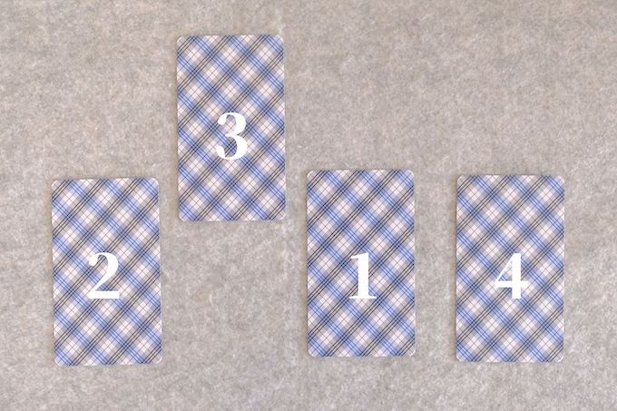 シャッフルしたタロットカードを三角形に並べたあと、左側に4枚目を置きます。