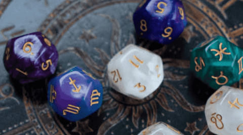 惑星のダイスと星座のダイスには占星術の記号、ハウスのダイスには1~12の数字が書かれています。
